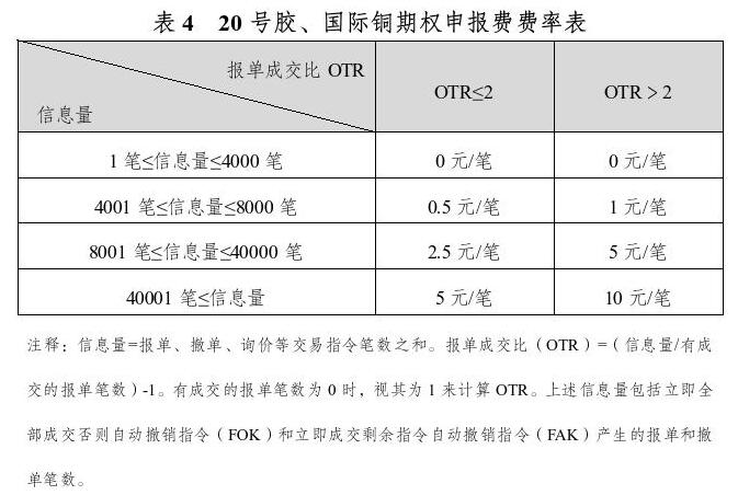 20号胶期权交易手续费为9元/手。自上市之日起至2026年12月31日止,套期保值交易手续费实施减半优惠,上期能源认定的高频交易者除外。行权(履约)手续费为9元/手;行权(履约)前期权自对冲手续费为9元/手;国际铜期权交易手续费为12元/手。自上市之日起至2026年12月31日止,套期保值交易手续费实施减半优惠,上期能源认定的高频交易者除外。行权(履约)手续费为12元/手;行权(履约)前期权自对冲手续费为12元/手;20号胶、国际铜期权对客户信息量收取申报费,具体如下表所示。